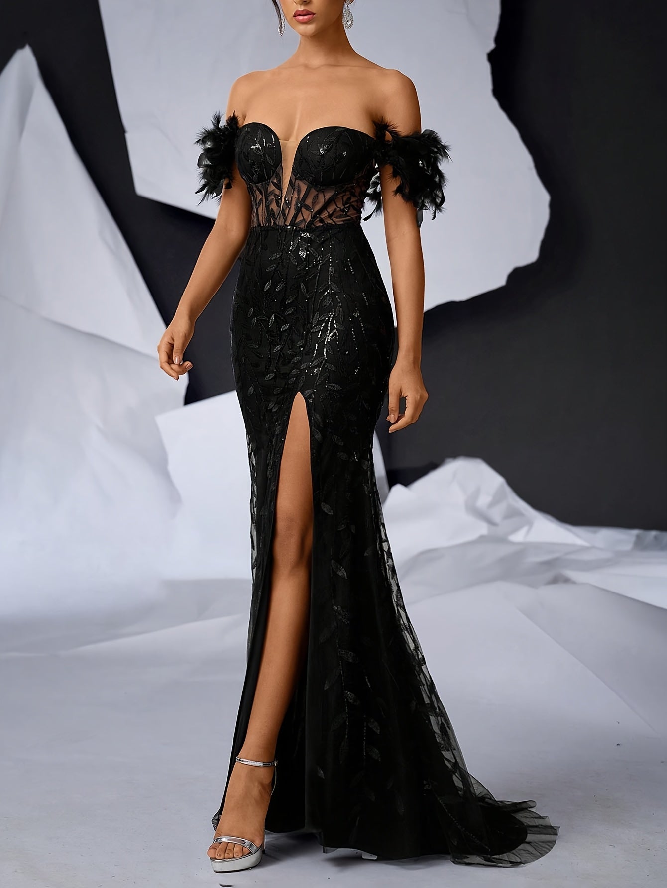 Valencia – Robe Fendue à Plume & Épaule Dénudée